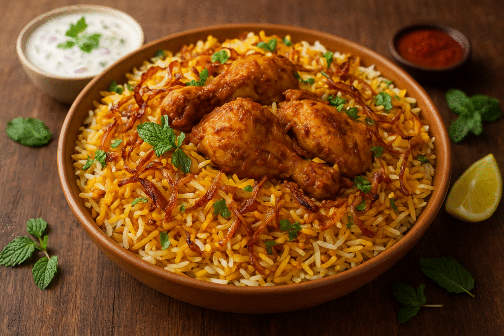 Learn how to make authentic chicken biryani at home with this step-by-step recipe. Packed with aromatic basmati rice, tender chicken, and bold spices — a royal treat for every occasion!